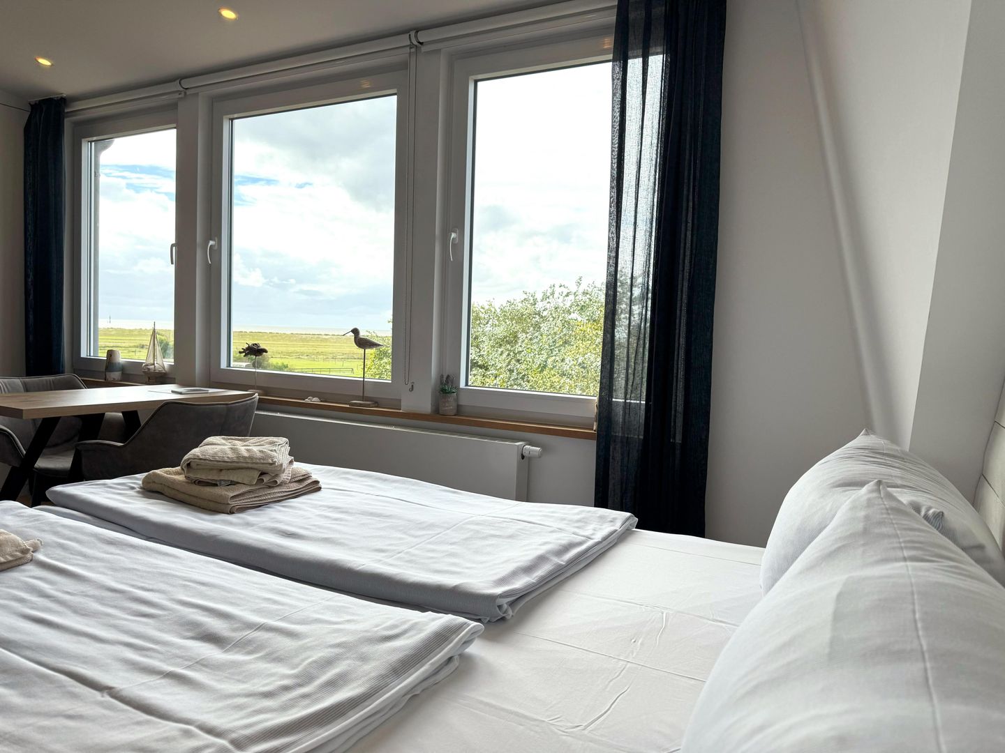 Vom Wohn-Schlafraum aus haben Sie einen weiten Blick über Wiese und Deich und können das bunte Treiben der Schiffe auf der Nordsee beobachten.