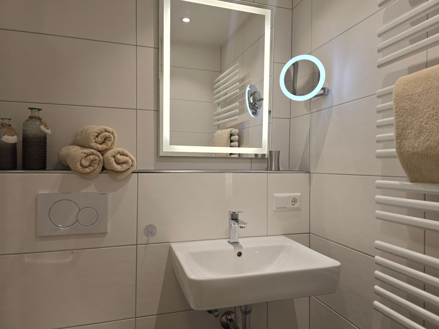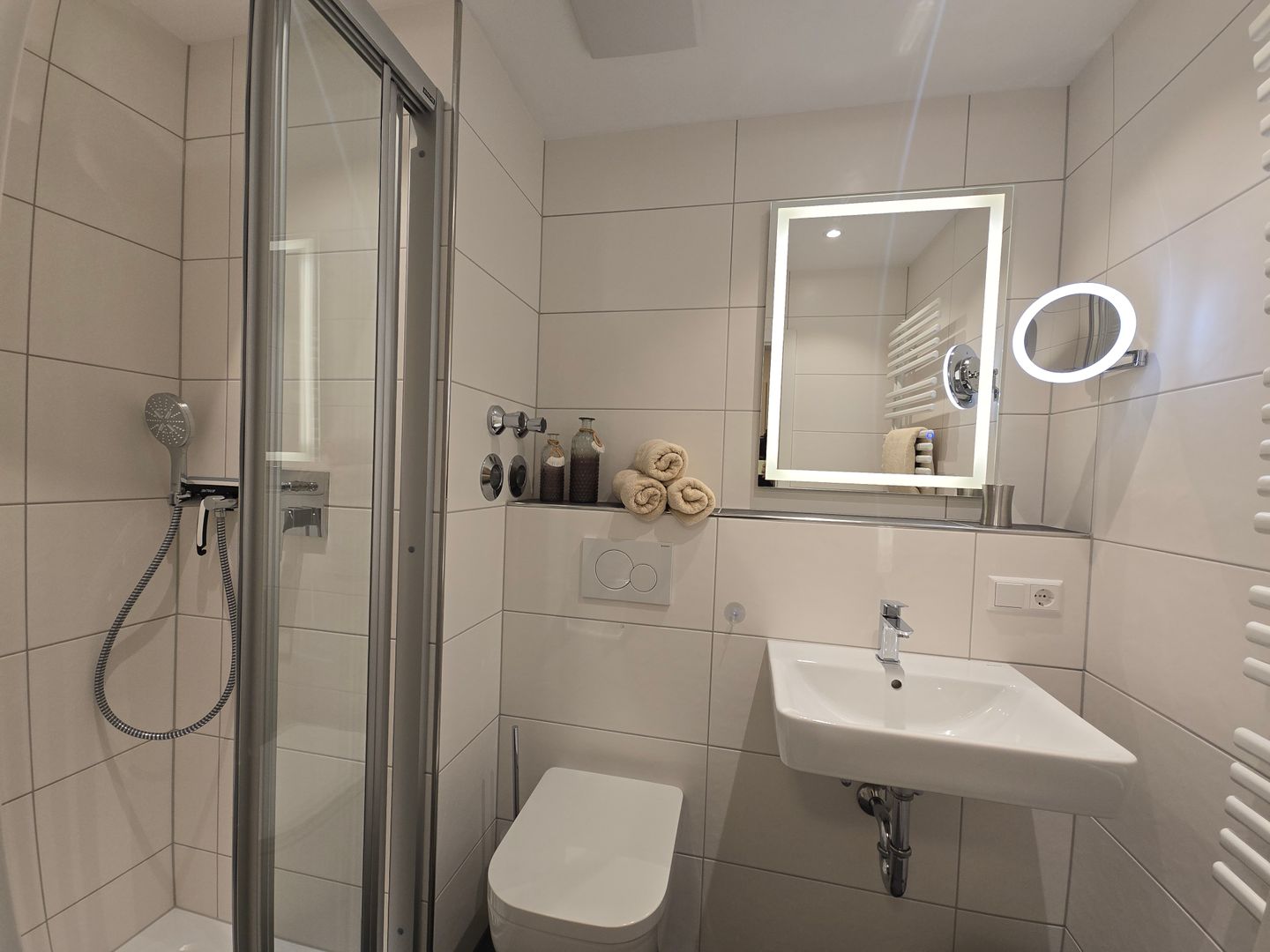großzügiger Wohn-Schlafraum mit offener Küchenzeile, Essbereich und Sofaecke (Schlafsofa 190 cm Liegefläche). Von 3 großen Veluxfenstern haben Sie einen hübschen Blick über den Platz bis zum Theater. Das separate Schlafzimmer mit Doppelbett (180*200) bietet problemlos Platz für ein eventuell benötigtes Kinderreisebettchen. Auch ein kleiner Flur mit Garderobe ist vorhanden. Badezimmer mit Dusche/WC.